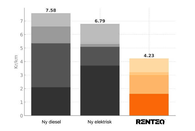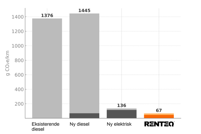 En levetidsforlængelse af et eksisterende køretøj ved konvertering til en elektrisk drivline, giver det laveste CO2-aftryk. CO2-aftrykket for fremstillingen af et fabriksnyt, elektrisk køretøj er minimum dobbelt så højt som for en konvertering fra RENTEQ.